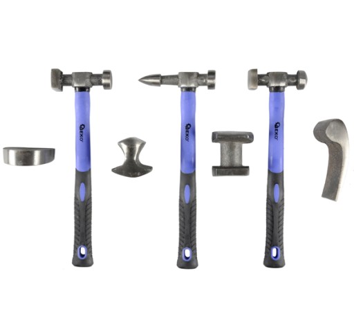 - 3 młotki o charakterystycznych płaszczyznach roboczych: standardowy młotek blacharski, młotek z prostym końcem szpiczastym, młotek z okrągłym i kwadratowym końcem