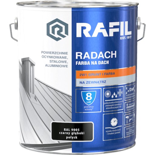 RAFIL Radach Farba Na Dach to wysokiej jakości farba do malowania dachów, rynien i parapetów. Produkt 2 w 1: grunt + farba. Zapewnia podwyższoną ochronę przed działaniem zmiennych warunków atmosferycznych i promieniowaniem UV. Ma zastosowanie zarówno do wykonywania nowych wymalowań, jak i renowacji starych powłok malarskich. Cechą szczególną jest doskonała przyczepność do podłoża oraz wysoka odporność na działanie korozji, światła, wody i innych czynników atmosferycznych.