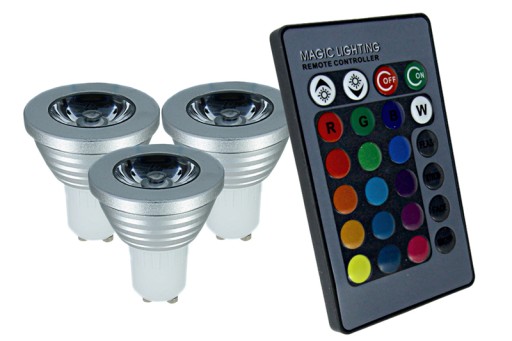 TRZY KOMPLETY - ŻARÓWKA GU10 3W RGB Z BEZPRZEWODOWYM PILOTEM!