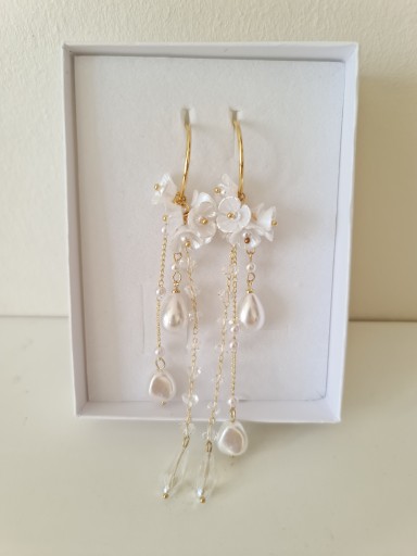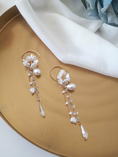 Kolczyki długie, wiszące, zdobione kryształkami i perłami, a do tego elementy w kolorze złota i kwiatowe z imitacji masy perłowej. Wszystko to składa się na najmodniejszy trend biżuterii ślubnej, idealny dla stylu boho, oraz boho glam.