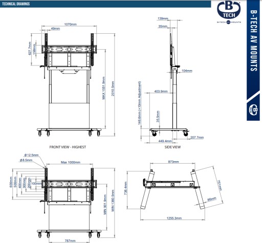 BT8568 to mobilne rozwiązanie przeznaczone do montażu dużych monitorów o przekątnej do 86". Elektroniczna regulacja wysokości umożliwia bezproblemowe podnoszenie i opuszczanie monitora za pomocą przewodowego panelu sterowania. Zakres regulacji wynosi do 650 mm. Wózek ten jest idealny do montażu interaktywnych monitorów dotykowych w środowiskach edukacyjnych i korporacyjnych.