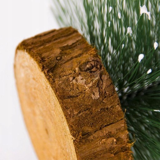 - kolory - zielona choinka z biały oprószeniem i drewnianą podstawą
