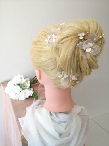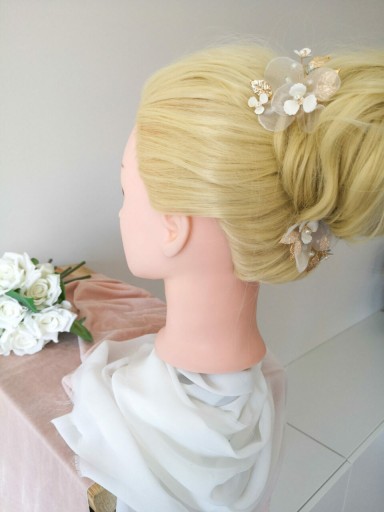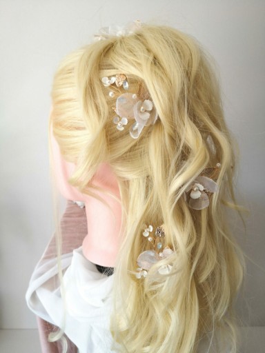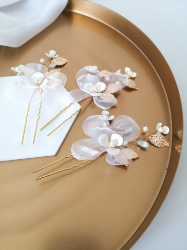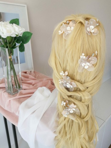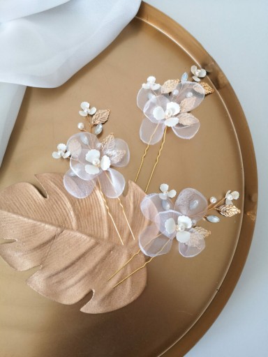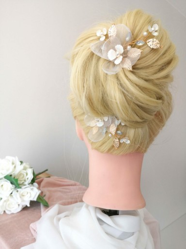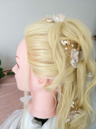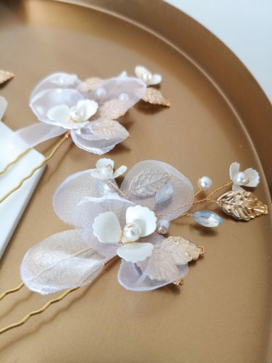Wsuwka ozdobna Blossom to świetny wybór, która można dostosować indywidualnie do własnego stylu i potrzeb. Wygląda kobieco, subtelnie i romantyczne zarówno wpięta w pojedynkę, jak i w większej ilości. Przepięknie przyozdobi każdego rodzaju ślubną fryzurę i dopełni stylizacji klasycznej, boho, czy rustykalnej. Zapewnia to wyważona kompozycja elementów ozdobnych w kolorze złotym (mocowanie, listki), białym (kwiatki, perły) oraz bardzo delikatnym pastelowym błękicie (cyrkonie).