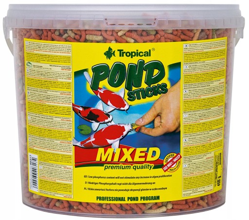 POND STICKS MIXED wieloskładnikowy pokarm w formie pływających pałeczek. Wieloskładnikowy pokarm w formie pływających pałeczek dla karpi koi, złotych rybek oraz innych ozdobnych ryb karpiowatych hodowanych w stawkach ogrodowych i sadzawkach. Pokarm w pełni zaspokaja potrzeby żywieniowe ryb, wzmacniając jednocześnie ich czerwone i złote wybarwienie. Obniżona zawartość fosforu zmniejsza dopływ tego pierwiastka do oczka wodnego wraz z pokarmem, redukując w ten sposób ryzyko zakwitu glonów. Pokarm stosujemy od wczesnej wiosny do późnej jesieni, w temperaturze wody powyżej 10°C oraz podczas zimowania ryb w pomieszczeniach zamkniętych.