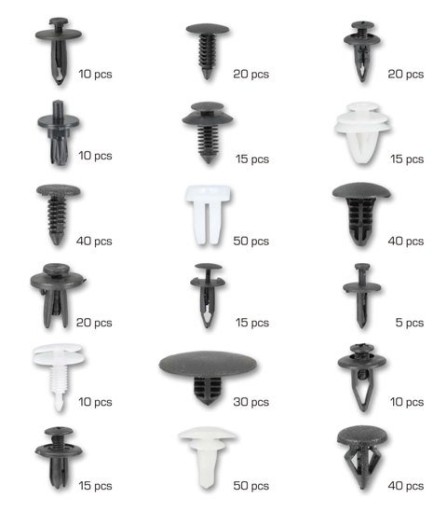 - Zestaw 18 różnych typów klipsów, w tym klipsy mocujące, zatrzaski, przelotki, klipsy ustalające, klipsy do listewek.