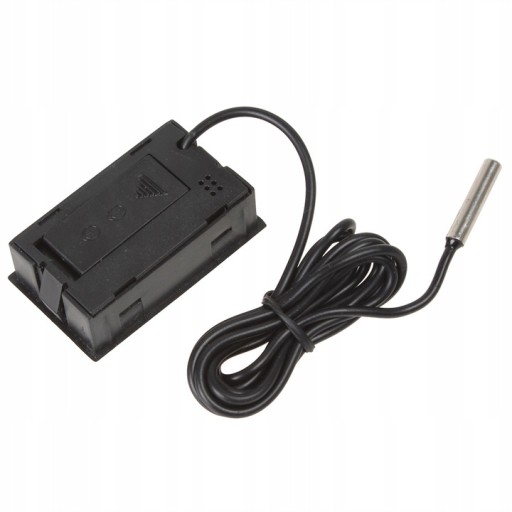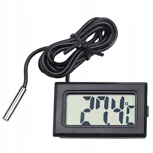 SPECYFIKACJA - zakres pomiaru temperatury: -50C <-> 110C; rozdzielczość wyświetlacza: 0,1C; dokładność pomiaru: +- 1C; zasilanie: 2x bateria LR44; wymiary (szer/wys/grub): 4,8x2,8x1,5cm; długość przewodu: 2m; waga: 30g