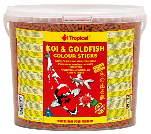 Koi & Goldfish Colour Sticks to pełnoporcjowy pokarm wybarwiający w postaci pływających pałeczek, dla wszystkich kolorowych karpi koi, złotych rybek oraz innych barwnych, ozdobnych ryb karpiowatych hodowanych w stawkach ogrodowych i sadzawkach. Regularnie podawany wydatnie intensyfikuje czerwone i złote ubarwienie. Struktura pałeczek powoduje, że pokarm utrzymuje się długo na powierzchni wody. Ułatwia to obserwację żerujących ryb i pozwala kontrolować ilość przyjmowanego przez nie pokarmu. Nadmiar pałeczek można łatwo usunąć z oczka wodnego przy pomocy siatki do ryb. Odpowiednio zbilansowana receptura, zawierająca składniki odżywcze pochodzenia roślinnego i zwierzęcego oraz zestaw witamin i mikroelementów, zapewnia rybom doskonałą kondycję i zdrowie. Pokarm w pełni zaspokaja potrzeby żywieniowe ryb, wzmacniając jednocześnie ich czerwone i złote wybarwienie. Koi & Goldfish Colour Sticks zjadany jest chętnie również przez niektóre płazy i raki zamieszkujące oczko wodne. Ryby regularnie karmione pokarmem Koi & Goldfish Colour Sticks są zdrowe, pełne życia i pięknie wybarwione.