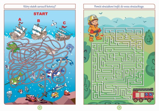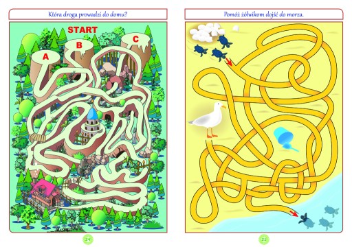 Labirynty to łamigłówki świetnie rozwijające umysł i wyobraźnię najmłodszych. Znalezienie właściwej drogi wśród poplątanych ścieżek to nie lada wyzwanie, wymagające skupienia, koncentracji i spostrzegawczości. Czasem dzieci będą musiały wydostać się z pułapki mniej lub bardziej skomplikowanych korytarzy, a niekiedy odkryć, która z dróg prowadzi do celu. W każdym z labiryntów czeka je mnóstwo zabawy i wrażeń, a kolorowe grafiki umilą czas spędzony z książeczką.
