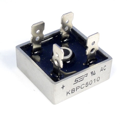 Mostek prostowniczy w obudowie MB25 o maksymalnym obciążeniem do 50A i 1000V. Posiada otwór umożliwiający przykręcenie radiatora.