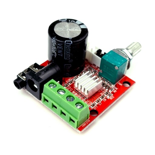 Wzmacniacz posiada potencjometr do regulacji głośności, złącza terminal block do kabli głośnikowych, wejście sygnału minijack 3,5 mm oraz wejście na zasilacz DC 2,1/5,5 mm, dwa miejsca na zworkę On/Off oraz Mute.