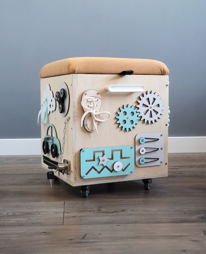 Każdy bok skrzyni to inne aktywności dla dziecka.