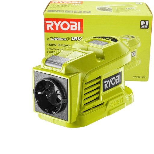 Przetwornica akumulatorowa RY18BI150A-0 Ryobi to swego rodzaju przenośne gniazdo elektryczne, które przyda się w terenie, np. w ogrodzie czy na campingu. Do przetwornicy można podłączyć urządzenie o maksymalnej mocy 150W, np. telefon, radio, latarkę LED, wentylator itp. Z jego pomocą można też ładować urządzenia zasilane z gniazda USB. Przetwornica jest przystosowana do pracy z akumulatorem litowo-jonowym 18V ONE+, który zapewni energię danemu urządzeniu, w granicach swojej pojemności. Po zainstalowaniu akumulatora przetwornica konwertuje prąd stały na prąd przemienny o napięciu 230V do zastosowań w gospodarstwie domowym lub na prąd stały o napięciu 5V w gnieździe USB (do 2,4A). Powstały w gnieździe prąd przemienny nie ma przebiegu sinusoidalnego, dlatego nie zaleca się używania przetwornicy do zasilania niektórych rodzajów wrażliwych urządzeń elektronicznych lub elektrycznych zawierających sprężarkę.