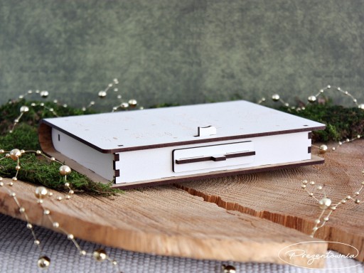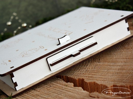 Pudełko wykonane jest ze sklejki w kolorze białym na zewnątrz, kolor naturalny brązowy jest wewnątrz pudełka. Zamykane jest na przesuwany mechanizm.