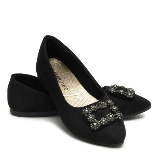 Eleganckie damskie baleriny na płaskim obcasie, wykonane ze skóry ekologicznej zamszowej. W środku - miękka wkładka z materiału tkaninowego. Nosek posiada metalową ozdobę z cyrkoniami w dopasowanym kolorze. Będą świetną ozdobą do codziennych stylizacji.