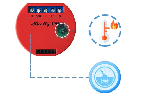Wewnętrzny czujnik temperatury do ochrony przed przegrzaniem. Jeśli temperatura PCB przekroczy poziom zagrożenia, urządzenie wyłączy się. Shelly 1PM natychmiast wyłączy obwód, jeśli wykryje zużycie wyższe niż zdefiniowane ustawienie nadmiernej mocy.
