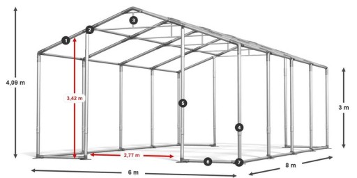 1 - Rury konstrukcyjne fi 50 mm 2 - Łączniki konstrukcji fi 54 mm 3 - Wzmocniona konstrukcja dachowa 4 - Mocne podwójne śruby przechodzące na wylot 5 - Wzmocnienia wjazdów 6 - Wzmocniona konstrukcja podłogowa 7 - Powiększone stopy fi 14 cm