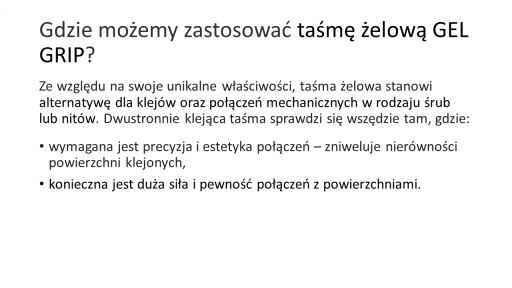 - Dwustronnie klejąca taśma żelowa jest specjalistyczną taśmą do tworzenia NIEWIDOCZNYCH POŁĄCZEŃ z materiałami gładkimi, szkłem i plexi.