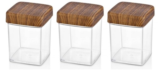 Kwadratowy pojemnik swoją nietuzinkowość zawdzięcza pokrywie, która swoim wyglądem przypomina drewno.