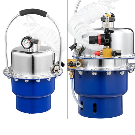 Zestaw do odpowietrzania hamulców z pompą podciśnienia hamulca, elektryczne urządzenie do odpowietrzania hamulców, do bezpośredniego mocowania na oryginalnym pojemniku/kanistrze, dzięki temu wyjątkowe pod względem stosunku ceny do wydajności. Może usuwać i wymieniać płyn z większości marek i modeli układów hamulcowych pojazdów, a także usuwa uwięzione powietrze. Najmniejszy dostępny elektryczny odpowietrznik hamulców z manometrem i reduktorem ciśnienia.