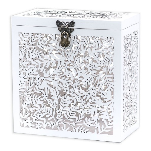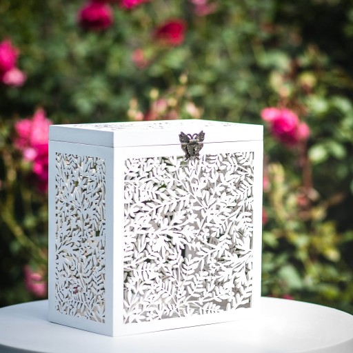 Biały kolor i ażurowy wzór roślinny doda uroku oprawie weselnej. Zamknięcie na kłódkę nada tajemniczego charakteru.