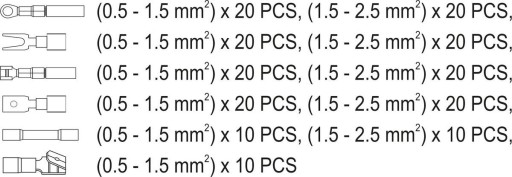 Zestaw konektorów izolowanych z wielofunkcyjnymi szczypcami YT-23133. Korpus szczypiec wykonano ze stali A3, a elementy ściągające izolację z wytrzymałej hartowanej stali narzędziowej ze stopu Cr12MoV. Rękojeści zabezpieczone dwukomponentowymi nakładkami z tworzywa sztucznego. Twardszy komponent z PP mocno przylega do korpusu, a zewnętrza część z TPR jest przyjemna w dotyku i posiada antypoślizgowe właściwości. Szczypce zabezpieczono przed korozją za pomocą metody oksydowania. Konstrukcja szczypiec umożliwia ściąganie izolacji zarówno z końcówek jak i ze środka przewodu. Ogranicznik głębokości sprawdza się podczas montażu przewodów np. w łącznikach czy w kostkach typu wago.