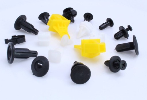 - Zestaw 18 różnych typów klipsów, w tym klipsy mocujące, zatrzaski, przelotki, klipsy ustalające, klipsy do listewek.