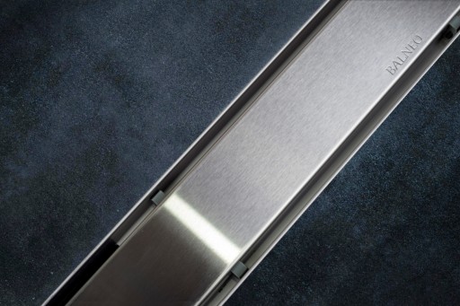Kompletny do montażu zestaw niskiego odpływu liniowego z dwustronnym panelem, głębokim osadnikiem i powiększonym syfonem firmy Balneo.