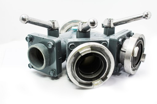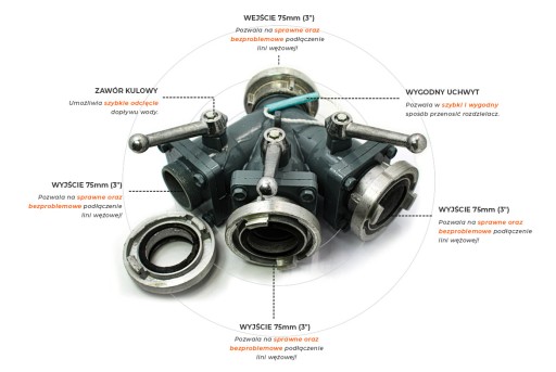 Wyloty rozdzielacza wyposażone są w niezależne wytrzymałe zawory kulowe, umożliwiające zamknięcie dopływu wody w pojedynczej linii wężowej. Na wlocie i wylotach znajdują się 3" (75mm) nasady służące do podłączenia linii wężowych.