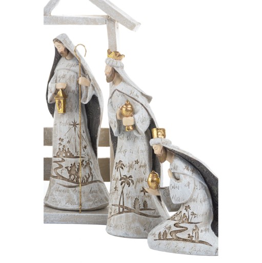 Ręcznie malowana szopka bożonarodzeniowa została wykonana z największą starannością i dbałością o szczegóły. W skład zestawu wchodzą figurki Świętej Rodziny, Trzech Mędrców, niosących dary oraz stajenka ze złotą Gwiazdą Betlejemską, tworząca tło scenerii. Szare szaty postaci ozdobiono ornamentami oraz lekko widocznymi napisami, imitującymi odręczne pismo.