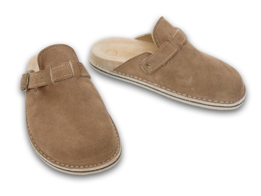 Klapki skórzane w całości wykonane są ze skór naturalnych (dwoina bydlęca). W krótkim czasie miękka ortopedyczna wkładka dopasowuje się do stopy zapewniając swobodę i komfort użytkowania. Klapki posiadają regulacje wysokości podbicia (pasek). Podeszwa wykonana jest z antypoślizgowego styrogumu. Obuwie objęte jest dwuletnią gwarancją producenta. Dostępne w kolorze cappuccino. Wyprodukowane w Polsce.