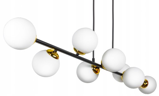 Nowoczesna lampa sufitowa - czarny żyrandol w kolorze ze złotymi akcentami. Klosze białe kule. Designerski styl, który doskonale wkomponuje się w Twoje wnętrza.