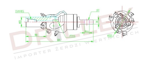 Przedmiotem sprzedaży jest rozwiertak pełny Fluted Reamer o średnicy roboczej fi200 oraz parametrach przedstawionych na powyższym rysunku technicznym. Rozwiertak oferujemy z krętlikiem 10T.