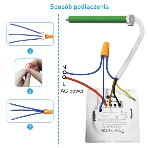 Przewód neutralny silnika jest wymagany, zwykle kolor przewodu neutralnego jest niebieski, proszę nie instalować przełącznika z dowolnym silnikiem DC (5-24V). Sterownik wymaga napięcia wejściowego 100-250V