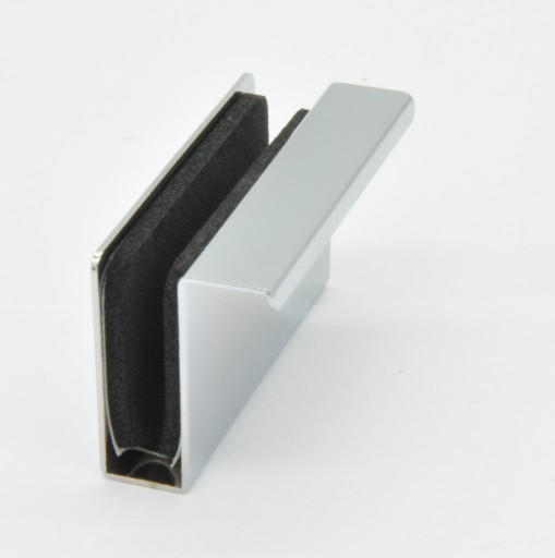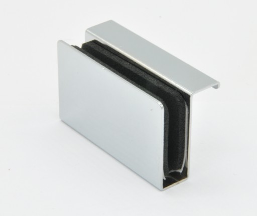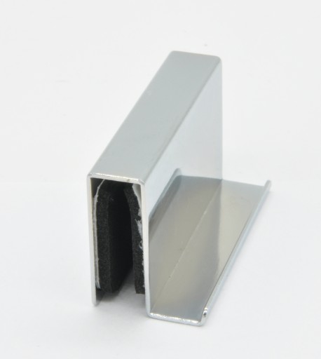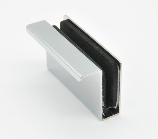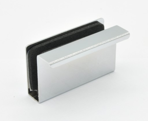 Opis: uchwyt wykonany jest z metalu pokrytego warstwą chromu. Uchwyt wyposażony jest w wkładkę z materiału gumowo-piankowego zapobiegającego przesuwaniu się założonego na szybie uchwytu. Montaż uchwytu polega na dogięciu jego ścianek do odpowiedniej grubości szklanych drzwi i wciśnięciu go.