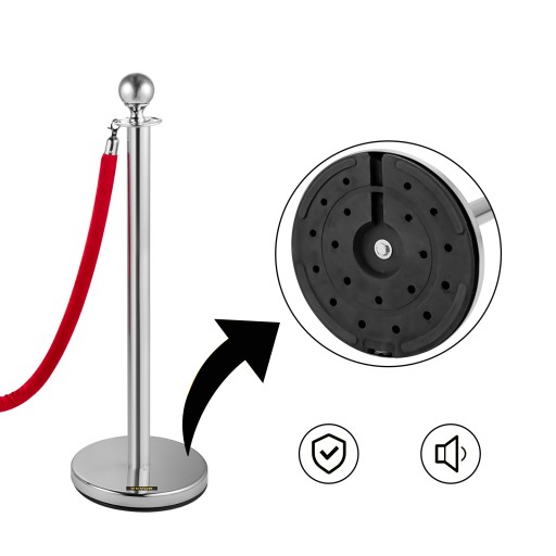 Gumowy ochraniacz podłogi zapobiega zarysowaniu powierzchni podłogi i zwiększa antypoślizgowość pomiędzy słupkiem a podłogą. Dzięki temu post będzie bardziej stabilny. Ciężka metalowa rama zapobiega jej przewracaniu się.