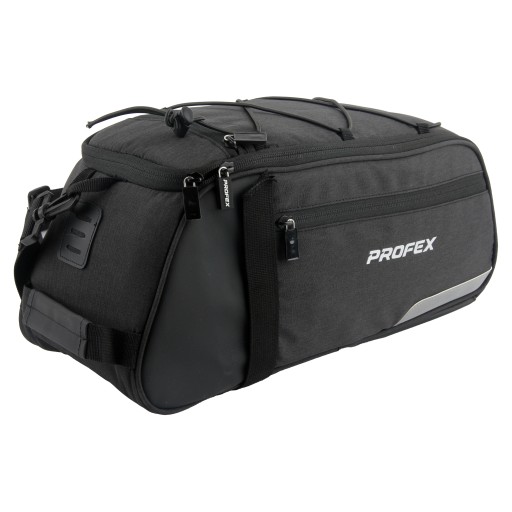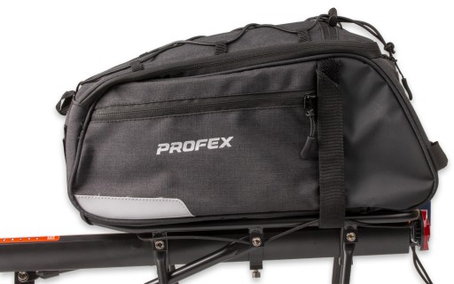 Torba rowerowa renomowanej marki PROFEX montowana na bagażnik za pomocą rzep. Produkt składa się z jednej komory o pojemności około 10 litrów oraz 4 kieszeni zapinanych na suwak. Dzięki zastosowaniu elementów odblaskowych rowerzysta jest zawsze widoczny na jezdni.