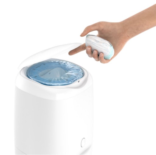 - Mechanizm pojemnika nie wymaga zawijania każdej pieluszki z osobna - po prostu wciśnij brudną pieluszkę przez szczelinę pojemnika. Dzięki takiemu rozwiązaniu zużycie folii jest kilku krotnie mniejsze niż w przypadku podobnych produktów konkurencji. Po zapełnieniu pojemnika (około 30 pieluszek) wystarczy odciąć worek z pieluszkami i zawiązać węzeł na dnie nowego worka - pojemnik jest gotowy do ponownego użycia.