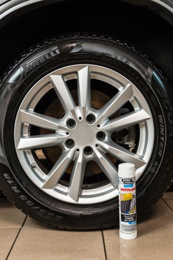 - Rozprowadź środek z odległości ok. 15 cm równomiernie na powierzchnię opony i pozostaw do wyschnięcia.