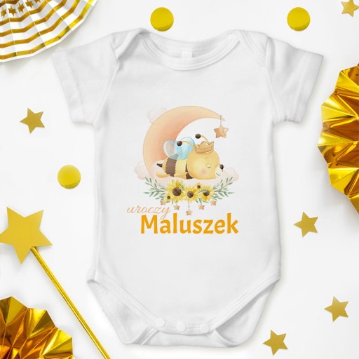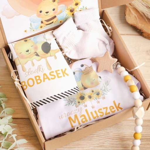 - w skład zestawu wchodzą białe skarpetki, śliniaczek z grafiką pszczółki, body z motywem pszczółki, ręcznie wykonana zawieszka do smoczka
