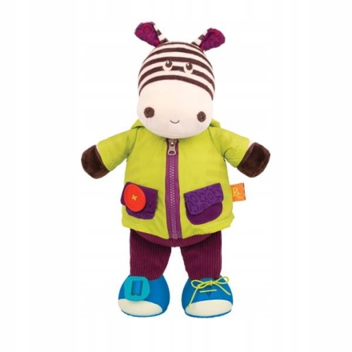 Elementy ubrania tej uroczej Zeberki stymulują wzrok i dotyk dziecka i są zróżnicowane sensorycznie.