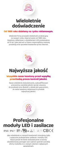 Kasetony świetlne z dibondu z serii ECONOMY zostały przez nas zaprojektowane z myślą o Klientach, którzy chcą otrzymać produkt wysokiej jakości za niewielką cenę. Moduły LED służące jako oświetlenie zostały rozmieszczone wzdłuż dłuższych krawędzi, dzięki temu grubość kasetonu to zaledwie 5cm. Maksymalne wymiary to 290x50cm.