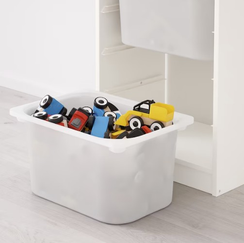Niski mebel z miejscem do przechowywania, dopasowany do wzrostu dziecka. Dzieciom łatwiej jest dosięgnąć i posprzątać swoje rzeczy.