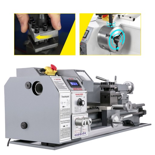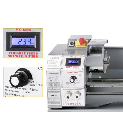 Bezstopniowa regulacja prędkości: Mini tokarka metalowa jest napędzana bezszczotkowym silnikiem o mocy: 1,1 KW. Zmienna prędkość (obr/min): 50-3000 ± 10%. Stożek końcówki wrzeciona: MT5. Ekran LED pokazuje wyraźną i precyzyjną prędkość dla dokładnej pracy. Łagodny start, komutator do obracania wrzeciona w prawo lub w lewo. Obsługiwać ręcznie lub z regulowaną automatyczną prędkością posuwu.
