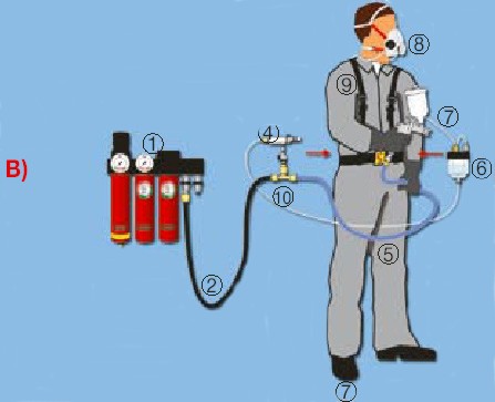 Zarówno powietrze do lakierowania jak i do oddychania uzdatniane jest przez zestaw filtrów dokładnego oczyszczania z węglem aktywnym np. SATA 0/484 (1) następnie przesyłane jest do trójnika (10) rozdzielającego powietrze do węża zasilającego pistolet do lakierowania (5) oraz do wężyka zasilającego i maskę