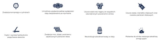 W wypadku gdy silniku pojawiły się problemy takie jak: lepkie pierścienie, nierówna kompresja, zwiększone zużycie oleju lub czarny dym, praca z preparatem powinna trwać ok 25-30 min zanim olej zostanie wymieniony.