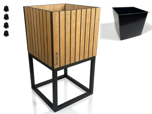 - Konstrukcja stelaża spawana, donica MDF barwiony, okleina dębu naturalnego. W zestawie plastikowy wkład do donic kwadratowych.