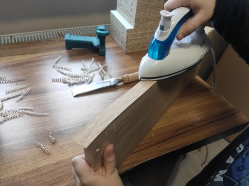 Okleinę przykładamy do brzegu płyty i gorącym żelazkiem przez chwilę dociskamy okleinę do płyty tak by klej się roztopił. Następnie należy docisnąć rozgrzaną okleinę do płyty, aby klej zastygł trwale łącząc się z płytą. Należy uważać by się nie poparzyć - ja używałem buteleczki po perfumach, ale może być też coś innego.