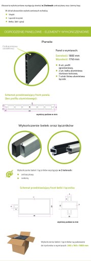 W skład standardowego kompletnego przęsła ogrodzeniowego o wymiarach 1750x1795mm, zapakowanego w karton o wymiarach 240x160x1800mm wchodzą / Deski ogrodzeniowe 20x200x1795mm WPC 8 szt; Belka aluminiowa startowa/końcowa 2 szt; Listwa aluminiowa łącznik 7 szt.