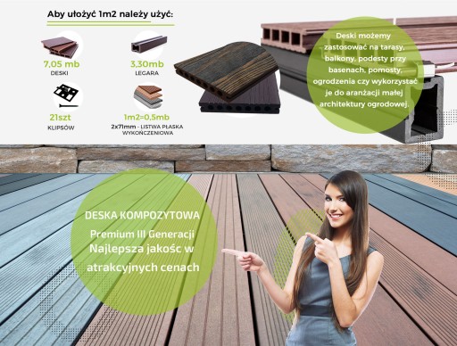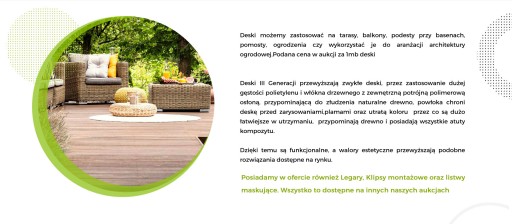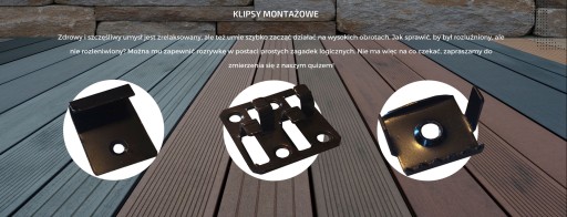 W sprzedaży posiadamy również elementy dodatkowe systemowe : Deski schodowe, startowe pełne 23x140x4000mm, listwy wykończeniowe płaskie 12x71x4000mm, legaty kompozytowe 20x40mm, legary kompozytowe 32x42mm, klipsy startowe, klipsy dystansowe, kliny do regulacji wysokości.
