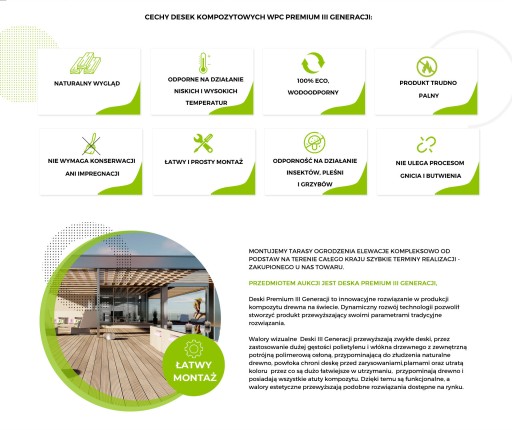 - możliwość wykończenia schodów i obrzeży tarasu pełną deską startową /nie ma potrzeby stosowania listew wykończeniowych, które są niepraktyczne i brzydkie wizualnie/
